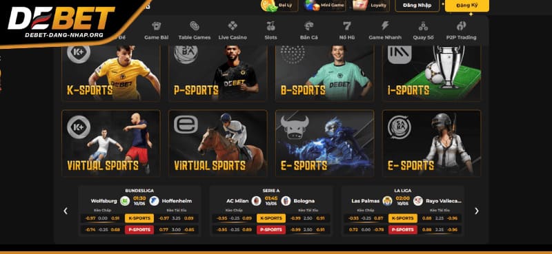 Debet mang đến một hệ thống cá cược thể thao chuyên nghiệp, đa dạng lựa chọn cho người chơi đam mê thể thao. Tại đây, bạn có thể dễ dàng đặt cược vào hàng loạt bộ môn phổ biến như bóng đá, tennis, bóng rổ, thể thao điện tử (esports), đua xe, cùng nhiều giải đấu hấp dẫn khác trên toàn thế giới. Giao diện trực quan, tỷ lệ kèo cạnh tranh và cập nhật liên tục chính là điểm cộng lớn của Debet trong mắt người dùng.